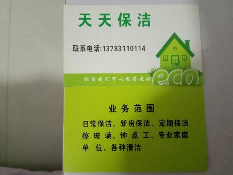 天天保洁公司:我公司有保洁员50名。 承揽伊川县各乡镇的 家庭 公司日常保洁服务,新旧房装修后保洁,玻璃清洗,壁纸清洗,油烟机清洗,空调清洗,过年大扫除,等!一个电话,进到您家,还您清洁心境!欢迎新老客户提前预约。